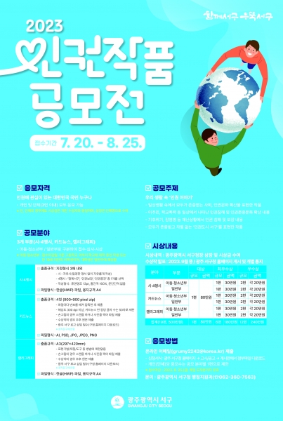 공모 분야는 시 카드뉴스 캘리그래피 총 3개 분야이며 주제는 일상생활 속에서 모두가 존중받는 사회, 인권문화 확산을 표현한 작품 이주민, 학교폭력 등 일상에서 나타난 인권침해 및 인권존중문화 확산 내용 기후위기, 감염병 등 재난상황에서 인권침해 및 인권보장 내용 모두가 존중 받고 차별 없는 ‘인권도시 서구’를 표현한 내용 등이다.
