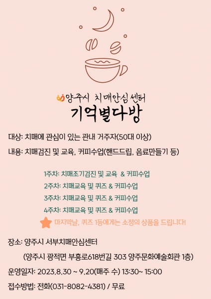 [금요저널] 양주시는 서부치매안심센터에서 치매 인식개선 프로그램 ‘기억별다방’사업을 실시할 예정이다.