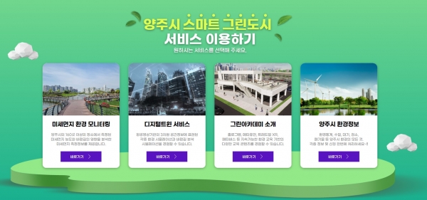 ‘미세먼지 인벤토리·환경모니터링 플랫폼’은 양주시 전역 160개소에 설치한 대기질 간이측정기를 통해 3차원으로 표현된 양주시 지도에 실시간 대기질 측정값과 다양한 환경정보를 제공하고 있으며 디지털 트윈서비스는 항공영상 기반의 3차원 공간정보에 표현된 각종 환경정보와 도시 기후 분석 시뮬레이션을 제공하는 플랫폼이다.