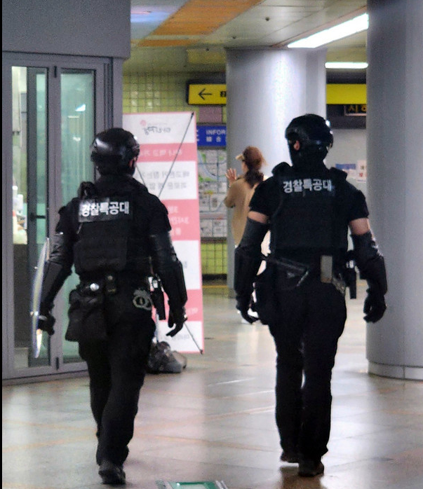 4일 오후 4시 경찰특공대원들이 성남시 분당구 구미동 오리역사를 순찰하는 모습. 한준호기자