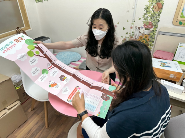 어린이집에 찾아가서 영양플러스 사업안내부터 영양교육의 필요성, 영유아 신체발육 표준치를 안내중이다.