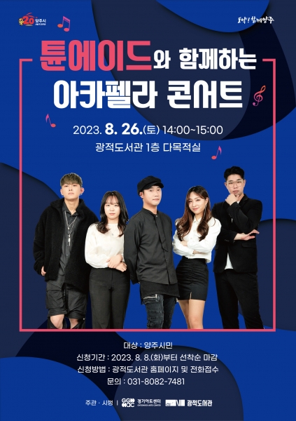 이번 공연은 오는 26일 광적도서관 1층 다목적실에서 진행되며 아카펠라 5인조 보컬그룹 “튠에이드”가 가요, 팝, OST 등 다양한 장르의 음악들을 아카펠라의 아름다운 하모니로 선보일 예정이다.