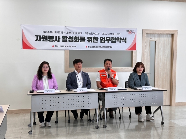 [금요저널] 사)양주시자원봉사센터는 지난 3일 양주시 옥정종합사회복지관, 양주시 회천노인복지관, 양주시희망노인복지관 등 3개 기관과 지역사회 복지증진과 자원봉사 활성화를 위한 업무협약을 양주시자원봉사센터 대회의실에서 체결했다고 밝혔다.