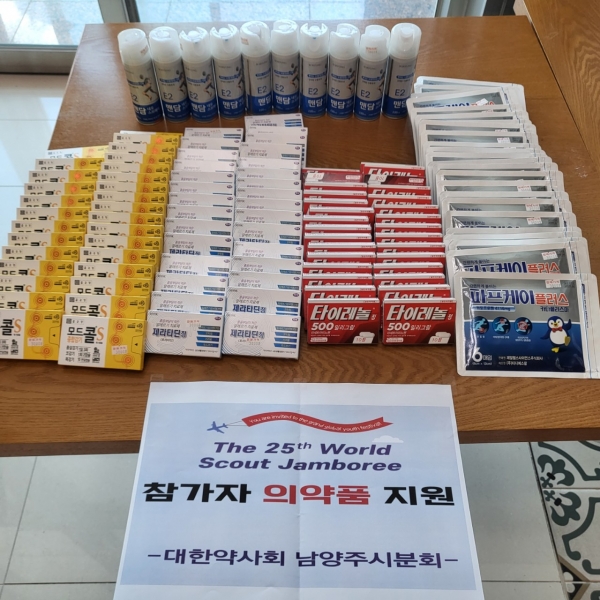 [금요저널] 남양주시약사회는 지난 8일 태풍‘카눈’상륙 전망으로 ‘제25회 새만금 세계스카우트 잼버리’ 요르단 스카우트 대원 40여명이 남양주시 진접읍 소재 경복대학교로 이동함에 따라 의료지원 운영을 위해 의약품을 무상 전달했다.