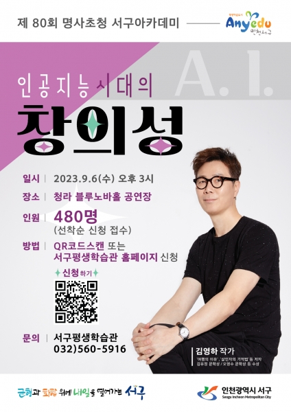 [금요저널] 인천 서구가 다음 달 6일 베스트셀러 인문학 작가인 김영하 씨를 초청해 ‘인공지능 시대의 창의성’이라는 주제로 강연을 진행한다고 14일 밝혔다.