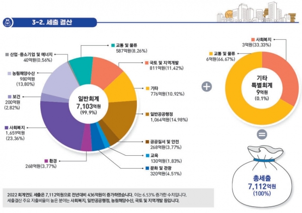 지출 내역을 보면, 가장 많이 지출한 분야는 사회복지분야로 1,659억원이 지출되어 일반회계 총 지출액의 1/4 정도인 23.36%이다.