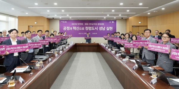[금요저널] 성남시는 17일 신상진 시장을 비롯해 간부 공무원과 산하기관 대표들이 참가한 가운데 반부패·청렴 내용을 점검하고 청렴 문화 구축과 청렴 조직문화를 대내외에 천명 및 확산하기 위해 ‘2023년 반부패·청렴 결의대회’를 열었다.