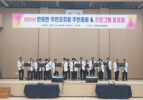 이번 프로그램 발표회에서는 운동주제 토크교실, 기타, 웰빙댄스, 실버색소폰 60명이 자신의 솜씨를 참석자에게 뽐냈으며 또한, 성인문해, 도자공예, 민화, 물빛수채화, 실버오감교실에서 100점 이상 수준 높은 작품이 전시돼 방문객들의 눈길을 끌었다, 안의면 주민자치회는 박남근 회장은 “더운 날에도 주민총회 및 프로그램 발표회 방문해 주신 주민들에게 감사드린다”며 “안의면이 살기 좋은 고장이 될 수 있도록 주민자치회에서 노력하겠다”고 말했다.