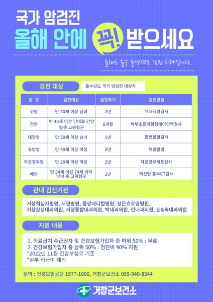 [금요저널] 거창군은 22일 우리나라 사망원인 1위인 암을 조기에 발견하고 치료율을 높이기 위해 국가 암검진을 이른 시일 내 받을 것을 군민들에게 당부했다.