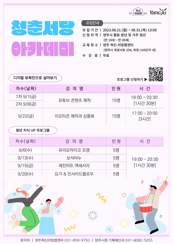 시 관계자는 “청춘서당 아카데미 프로그램을 통해 청년들이 자신의 가능성과 기회를 발견하고 스스로 역량을 강화해 자신만의 비전을 만들 수 있는 기회가 되기를 바란다”고 전했다.
