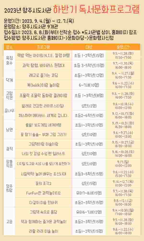 [금요저널] 양주시립도서관는 ‘2023년 하반기 독서문화 프로그램’을 운영한다고 22일 밝혔다.