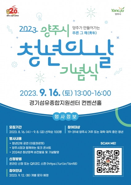 [금요저널] 양주시는 오는 9월 16일 청년의 날을 맞아 경기섬유종합지원센터 컨벤션홀에서‘청년의 날 기념 토크 콘서트’를 개최한다.