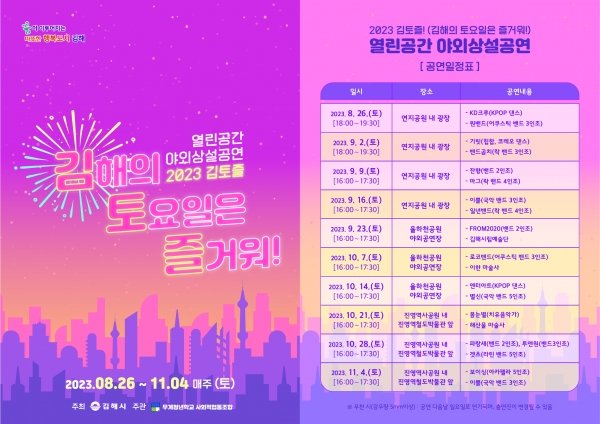 [금요저널] 김해시는 오는 26일부터 11월 4일까지 10주간 매주 토요일 김토즐 열린공간 야외상설공연을 개최한다고 밝혔다.