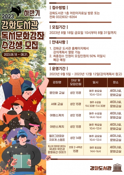 [금요저널] 강화군은 지역주민의 독서문화 활성화와 생애 주기별 평생교육의 장 마련을 위해 강화군도서관에서 ‘하반기 독서문화프로그램을’ 운영한다.