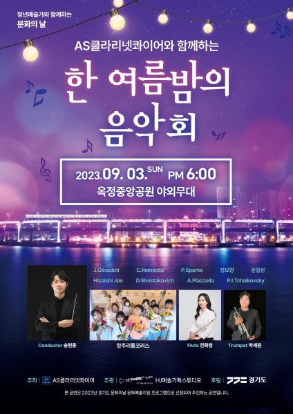 [금요저널] 양주시는 오는 9월 3일 오후 6시 옥정중앙공원 야외무대에서 ‘청년예술가와 함께하는 문화의날’ AS클라리넷콰이어와 함께하는 ‘한 여름밤의 음악회’를 개최한다고 밝혔다.