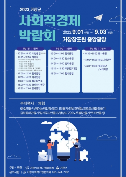 이번 박람회는 ‘같이 걷는 우리, 함께하는 사회적경제’를 슬로건으로 거창군사회적기업협의체가 주최·주관하고 거창군, 한국수자원공사 합천댐지사, 서울우유협동조합 거창공장이 후원한다.
