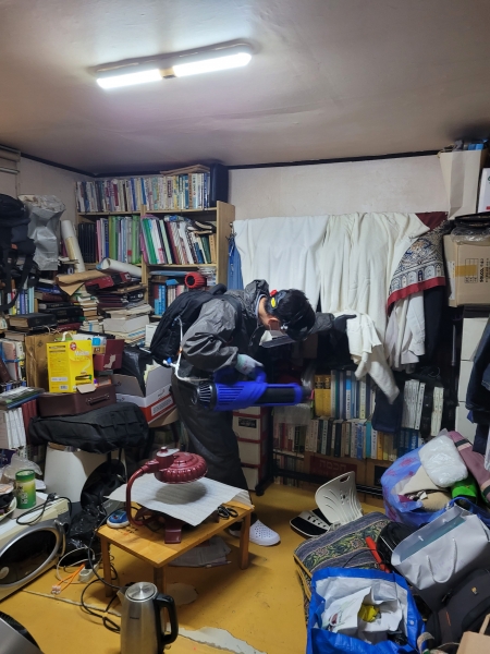화곡1동주민센터가 지역 내 노인복지센터와 협력해 주거환경이 열악한 저소득 가구를 발굴하면, 김철호 통장과 윤대규 대표가 동 주민센터 직원과 함께 해당 가구를 방문해 살균 및 살충 작업을 실시한다.