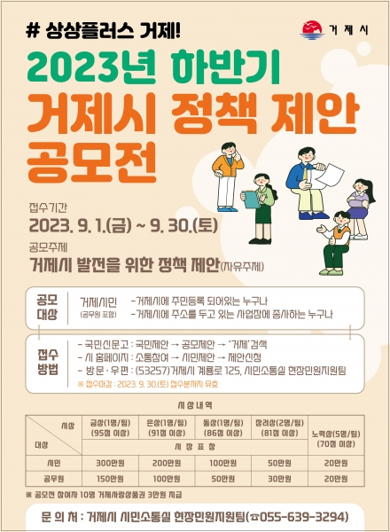 [금요저널] 거제시는 오는 9월 1일부터 30일까지 거제시 발전을 위한 자유주제로 “#상상플러스 거제 2023년 하반기 거제시 정책 제안 공모전”을 진행한다고 밝혔다.