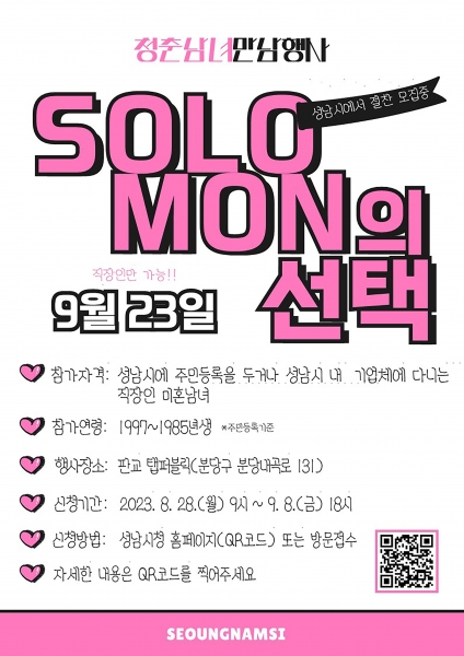 [금요저널] 성남시는 미혼남녀 만남의 자리인 ‘솔로몬의 선택’ 행사를 오는 9월~11월에 3번 더 개최하기로 했다.
