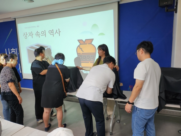 이날 사회적경제 체험 행사는 가야유물 촉각체험과 대성동고분군 스칸디아모스 액자 만들기 체험을 진행해 평소 쉽게 접하기 어려운 김해지역의 특색과 역사를 쉽고 재밌게 배우고 이를 통해 사회적경제에 대한 친근감을 높이는 동시에 사회적경제의 중요성을 알리는 시간이 됐다.