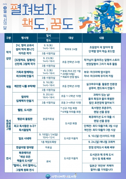 9월 9일에는 학부모 대상으로 초등맘이 꼭 알아야 할 영어독서 비법을 알려주는 이지은 영어교육 전문가 강연, 23일에는 어린이 대상으로 달평씨 그림책 시리즈로 유명한 신민재 작가와의 만남을 진행한다.