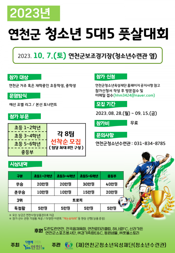 [금요저널] 연천군청소년육성재단은 오는 10월 7일 연천군보조경기장에서 열리는 ‘2023년 연천군 청소년 풋살대회’ 참가자를 모집한다.