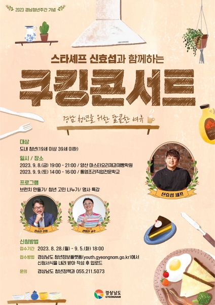 [금요저널] 경남도가 경남 청년들을 응원하고 청년세대에 대한 관심 제고를 위해 다음달 8일과 9일 양일간 쿠킹콘서트를 개최한다고 밝혔다.