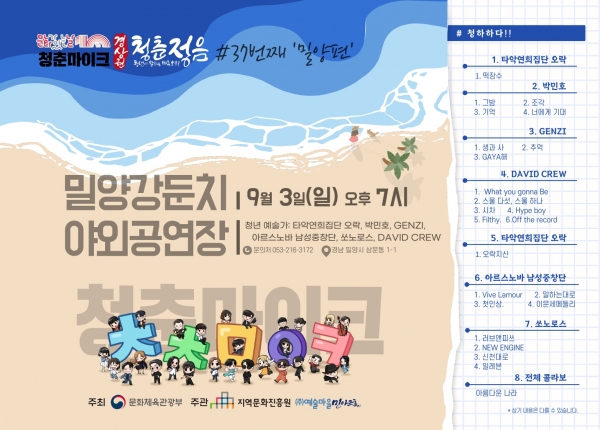 [금요저널] 2023년 문화가 있는 날 청춘마이크 경상권 공연이 오는 9월 3일 오후 7시 밀양강둔치 야외공연장에서 열린다.