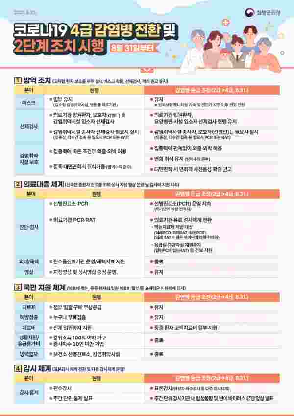 고위험군 보호를 위해 병원급 의료기관·입소형 감염취약시설 내 마스크 착용 의무는 현행대로 유지하고 전 국민 치료제·백신 무상 지원 및 중증 환자의 입원 치료비 일부 지원, 우선순위 검사비 지원 등 고위험군에 대한 정부 지원체계는 그대로 유지한다.