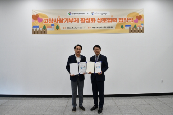 [금요저널] 사천시시설관리공단과 양산시시설관리공단은 29일 고향사랑기부제 상호교차 기부를 위한 업무협약을 체결했다.