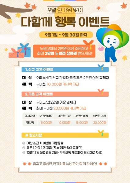 이번 이벤트는 9월 한 달 동안 배달앱 누비고에서 2만원 이상 결제 시 최대 모바일 누비전 2만원을 캐시백으로 제공하는 행사이다.