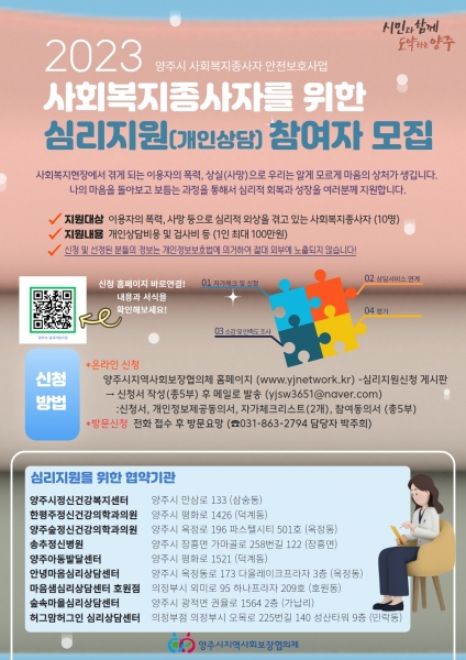 [금요저널] 양주시지역사회보장협의체에서는 사회복지현장에서 이용자의 폭력, 상실 등에 노출되어 직무외상을 입은 종사자가 실천현장에서 안전하게 보호받으며 사회복지서비스를 제공할 수 있도록 ‘2023년 양주시 사회복지종사자 안전보호사업’을 운영하고 있다.