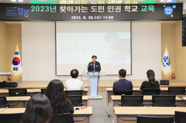 [금요저널] 함양군은 8월 30일 군청 대회의실에서 군청 공무원 50여명을 대상으로 ‘2023년 찾아가는 도민 인권학교’ 교육을 실시했다.