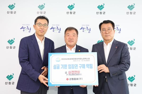 산청세계전통의약항노화엑스포조직위원회는 30일 산청군 집무실에서 산청음료㈜와 산청세계전통의약항노화엑스포 성공 개최를 기원하는 입장권 사전 구매 약정을 체결했다.