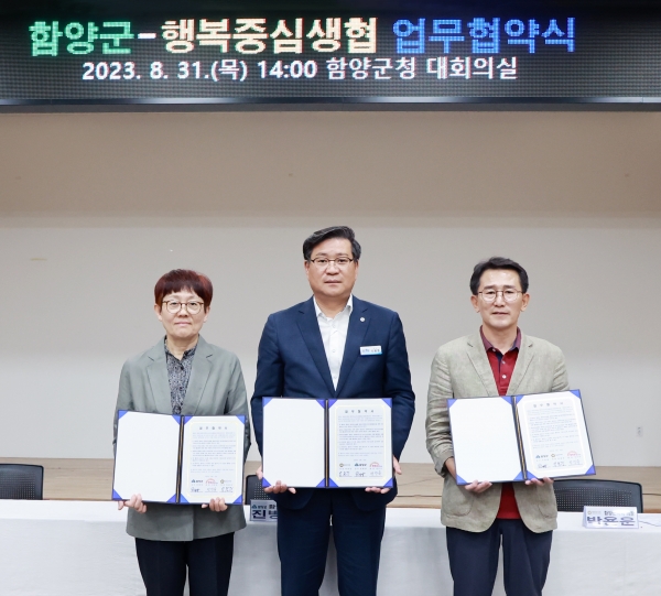 [금요저널] 함양군은 8월 31일 함양군청 대회의실에서 행복중심소비자생활협동조합과 농특산물 유통 확대를 위한 업무협약을 체결했다.