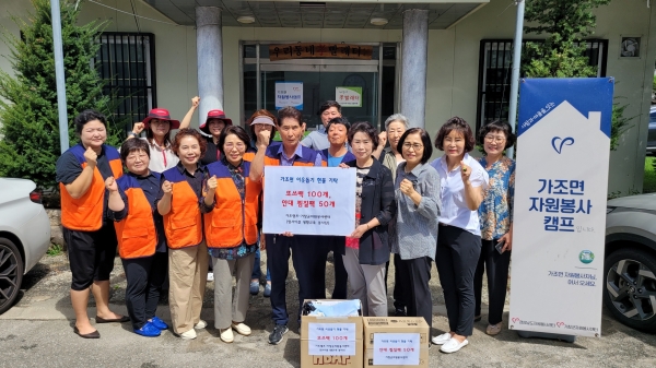 [금요저널] 거창군은 31일 가조면 자원봉사캠프에서 거창군 자원봉사센터, 자원봉사캠프지기, 가조권역 통합돌봄센터, 업사이클 봉사단 등 20여명이 참석한 가운데 재활용 장바구니‘또쓰백’과 친환경 안대 ‘찜질팩’ 전달식을 열었다.