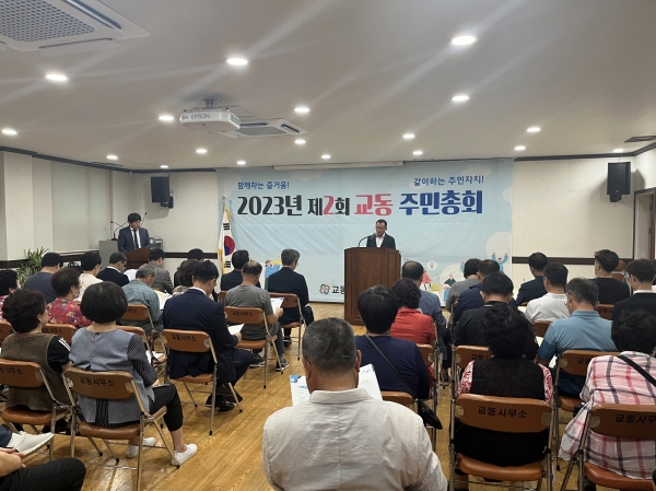 [금요저널] 밀양시 교동 주민자치회는 행정복지센터에서 주민자치위원, 통장, 기관·단체장 등 지역주민 50여명이 참여한 가운데 제2회 주민총회를 개최했다고 1일 밝혔다.