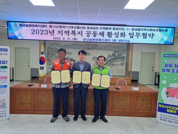 [금요저널] 창녕읍행정복지센터는 지난달 31일 협력체계 구축을 통한 복지위기가구 발굴 및 지원을 강화하고자 한국112무선봉사단 경남지역본부 창녕지단 및 창녕읍지역사회보장협의체와 ‘지역복지 공동체 활성화 업무협약’을 체결했다고 밝혔다.
