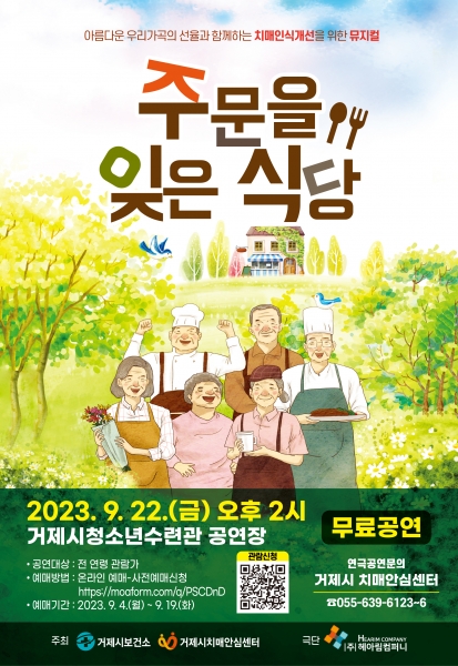 [금요저널] 거제시 치매안심센터는 오는 9월 22일 오후 2시부터 고현동 거제시청소년수련관 공연장에서 지역 주민과 치매환자, 가족 대상으로 ‘2023년 치매극복의 날 기념 치매인식개선 뮤지컬 ‘주문을 잊은 식당’’공연을 개최한다고 밝혔다.