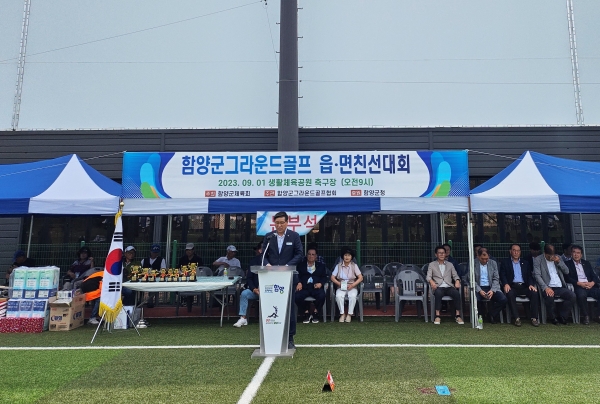 [금요저널] 함양군은 9월 4일 생활체육공원 축구장에서 11개 읍·면 선수 및 임원 등이 참여한 가운데 ‘2023년 노인그라운드골프 읍면친선대회’를 개최했다.