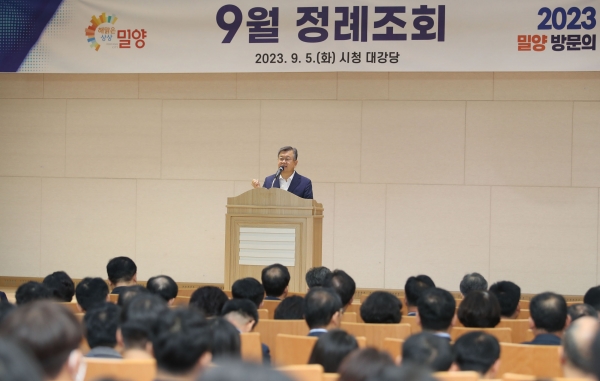 [금요저널] 밀양시는 5일 시청 대강당에서 본청 전 직원, 직속기관 담당주사 이상, 읍면동장 및 산하기관 팀장급 이상 직원 등 300여명이 참석한 가운데 9월 정례조회를 가졌다.