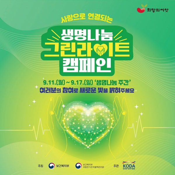 한편 이번 캠페인에는 시민들이 생명나눔의 소중함을 함께 나누고 참여할 수 있는 이벤트가 진행되며 SNS에 일상 속 초록빛 순간을 담아 그린라이트나 생명나눔을 기발하게 표현한 참가자 80명에게는 소정의 상품이 제공된다.