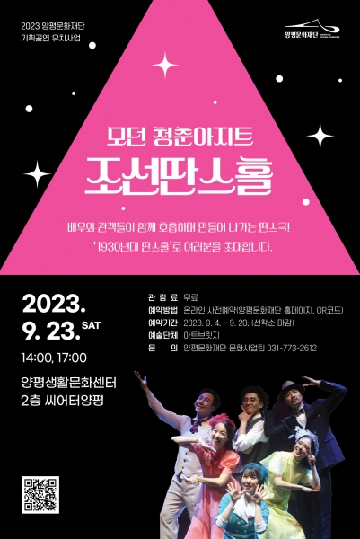 ‘조선딴스홀’은 1930년대 일제강점기 일본이 경성에서 사교댄스를 금지하고 딴스홀을 폐쇄하자 지식인과 예술가들이 “딴스홀을 허하라”는 탄원서를 제출했던 실제 사건을 바탕으로 한 작품으로 23일 오후 2시와 5시, 총 2회에 걸쳐 양평생활문화센터 2층 씨어터양평 무대에서 관객들을 만난다.