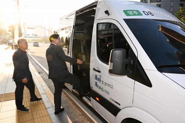 강 시장은 옥정 e편한세상 에듀써밋 앞 버스승강장에서 똑버스에 탑승해 출근하는 시민들의 승차 환경을 확인했다.