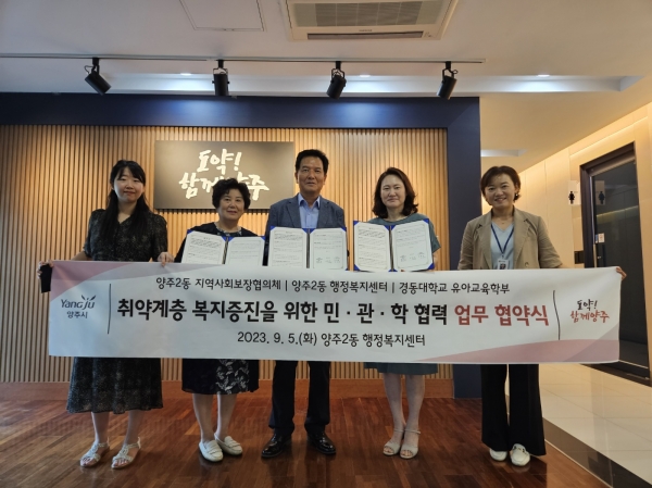 [금요저널] 양주시 양주2동은 지난 5일 지역사회보장협의체, 경동대학교 유아교육학부와 함께‘취약계층 아동 복지증진을 위한 민·관·학 업무 협약식’을 체결했다고 밝혔다.