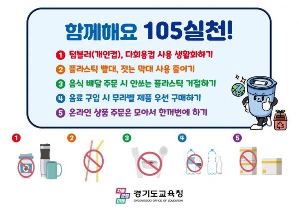 도교육청은 일회용품 Zero를 위한 5가지 실천 수칙인 ‘함께 해요 105 실천 수칙’을 마련해 다양한 채널을 활용한 홍보활동을 펼치는 등 탄소중립 실현과 친환경 교육문화 조성을 위해 적극적으로 노력하고 있다.