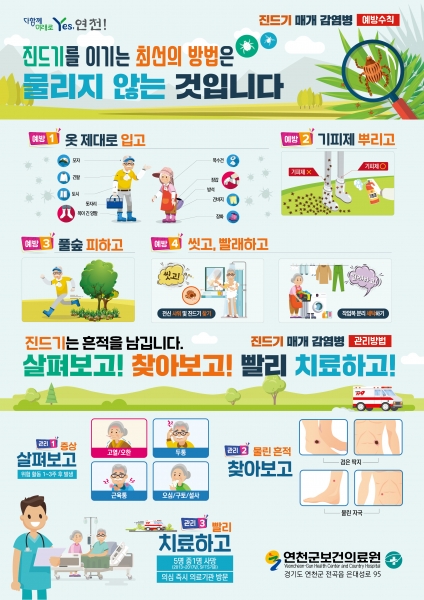 연천군보건의료원 관계자는 “진드기 매개 감염병 예방을 위해 교육 및 캠페인 활동과 등산로 산책로 입구에 현수막을 설치해 지속적인 홍보를 하고 있다”며 “농작업 활동과 야외활동 시 진드기에 물리지 않도록 예방수칙을 준수하고 고열 및 설사 등 의심 증상이 나타났을 경우 신속히 의료 기관을 방문해 치료받길 바란다”고 전했다.