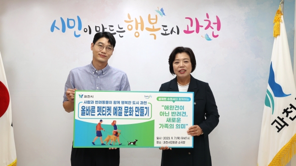 한편 과천시는 반려동물 문화교실 프로그램 중 하나로 9월 2일부터 매주 토요일 마다 관문체육공원에서 ‘반려견 산책교육’을 진행하고 있으며 사회적 배려계층과 1인 가구의 반려동물 진료비 부담을 덜어주는 ‘반려동물 의료서비스 비용 지원 사업’과 경제적·지리적 여건으로 동물병원 이용이 어려운 반려동물이 최소한의 동물복지 혜택을 받을 수 있도록 하는 ‘찾아가는 반려동물 간이 건강검진’ 등을 추진하는 등 반려동물 관련 정책 추진에 힘을 쏟고 있다.