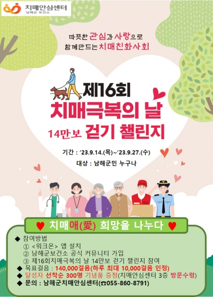 [금요저널] 남해군 치매안심센터가 제16회 치매극복의 날을 기념해 11일부터 27일까지 치매극복주간 행사를 실시한다고 밝혔다.