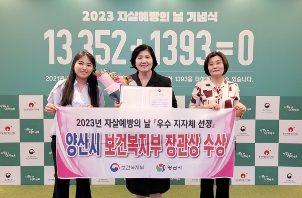[금요저널] 양산시는 2023년 자살예방의 날 유공 우수 기초지자체로 선정돼 지난 8일 보건복지부 장관 기관표창을 수상했다.